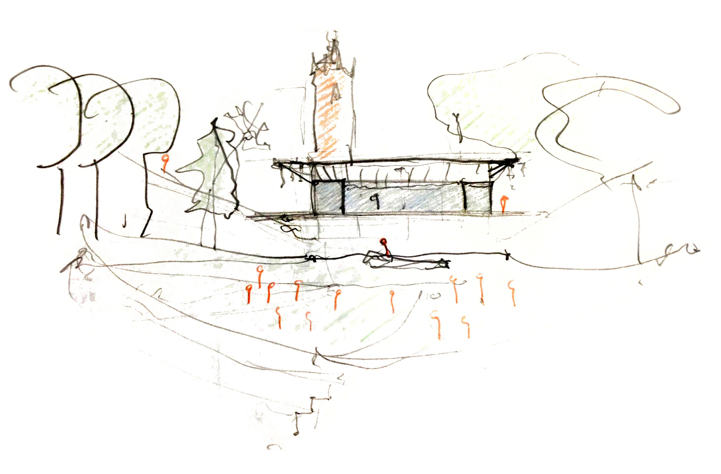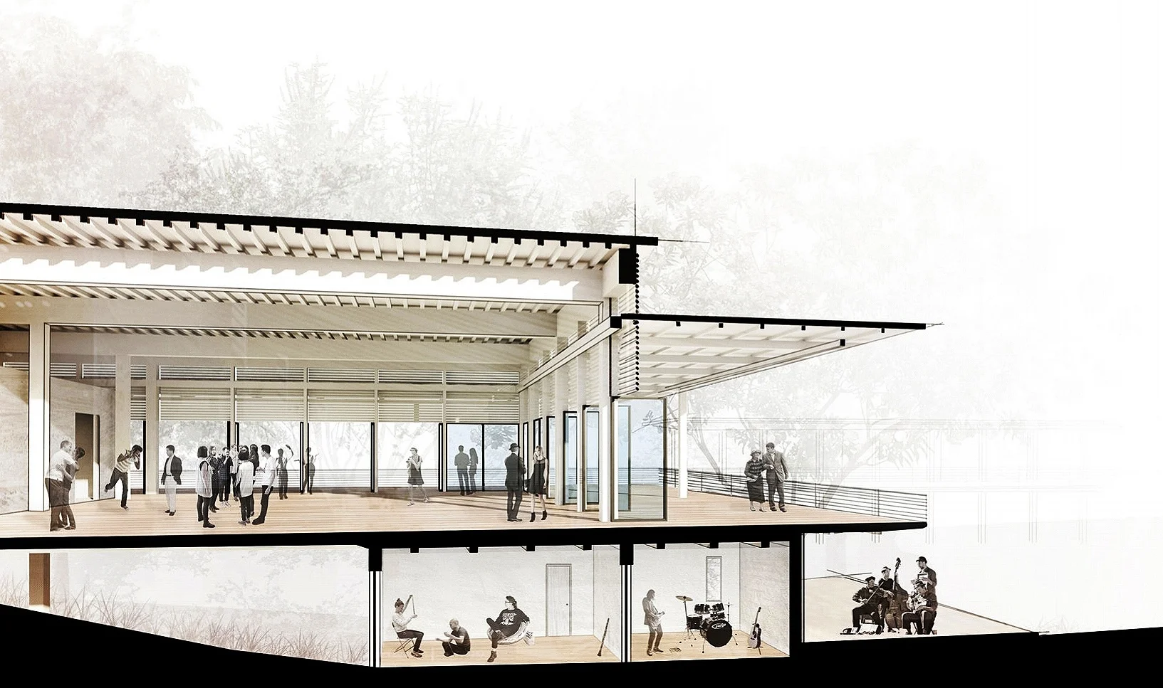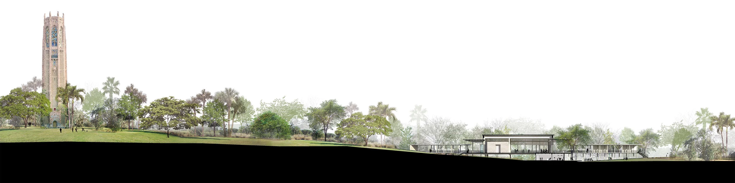 The project proposes an enclosed reception hall for approximately 300 people and an open air amphitheater. The transparent nature of the building, alongside the use of wood as the main structural material, allows the building to blend with the surrounding landscape. Raising the existing topography of the site gave way to create an open air amphitheater, allowing visitors to face the stage, as well as the Bok tower. The design seamlessly allows the Architecture and Nature to exist as one.