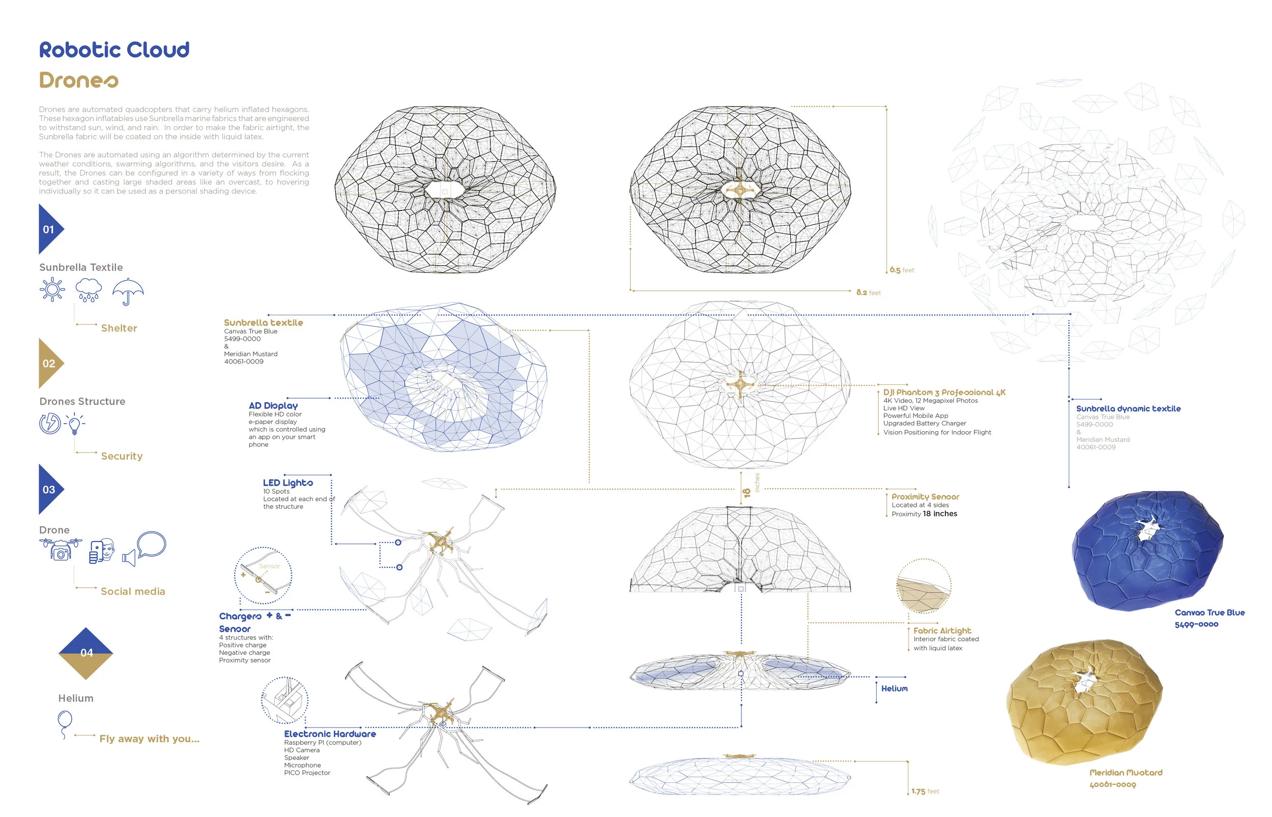 The workers, Drones, are automated quad-copters that carry helium inflated hexagons. The Drones are automated using an algorithm determined by the current weather conditions, swarming algorithms, and the visitor’s desire. In addition, the quad-copter carries an electronic box holding a Raspberry Pi, a camera, a mini projector, a speaker, and a microphone, which gives the Drones greater flexibility to respond and communicate with the visitor’s desires and needs. This has the potential for advertisement, way-finding instructions to the user, and data analysis.